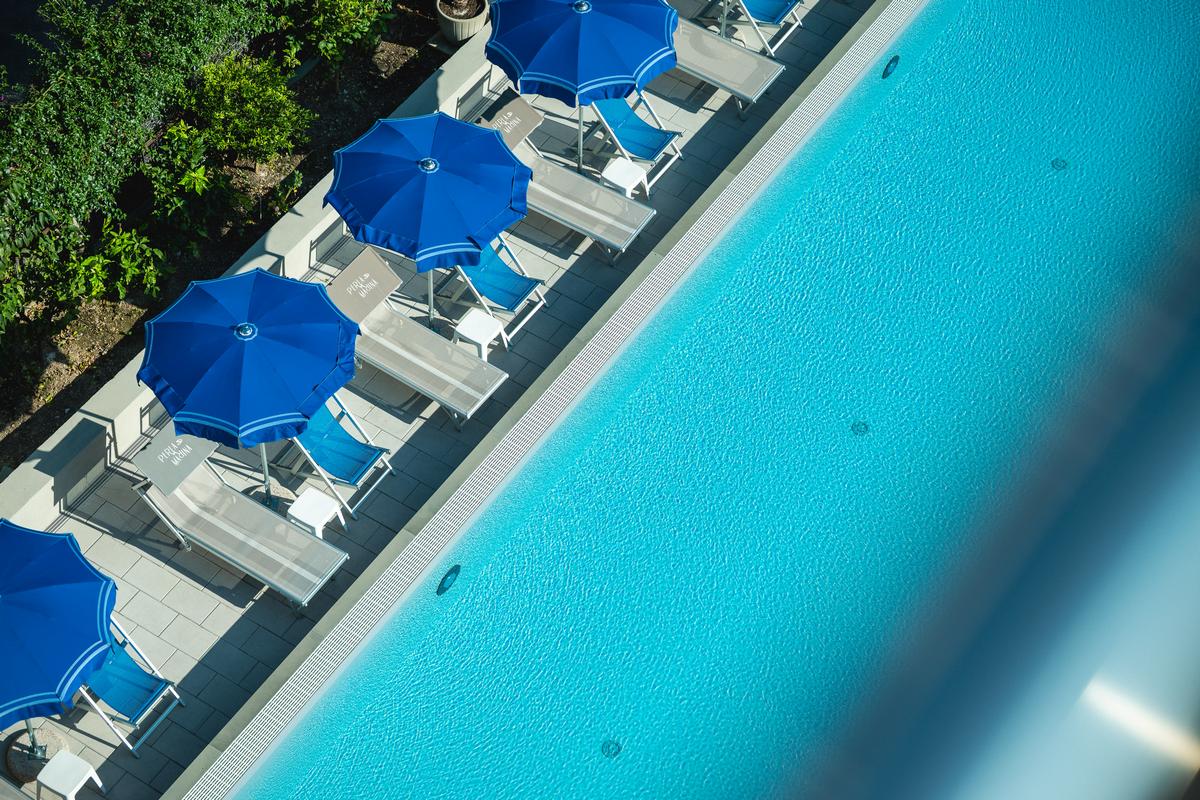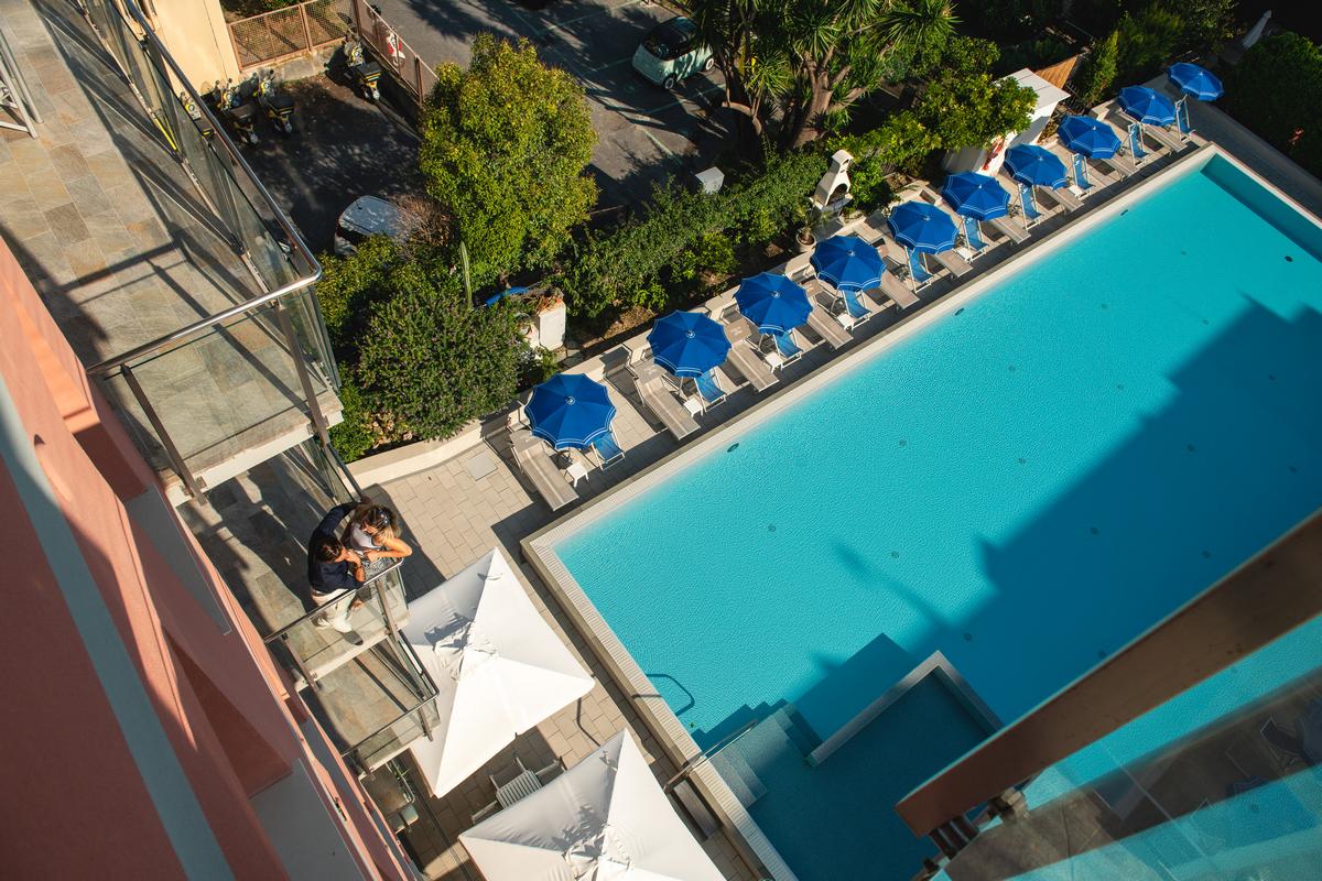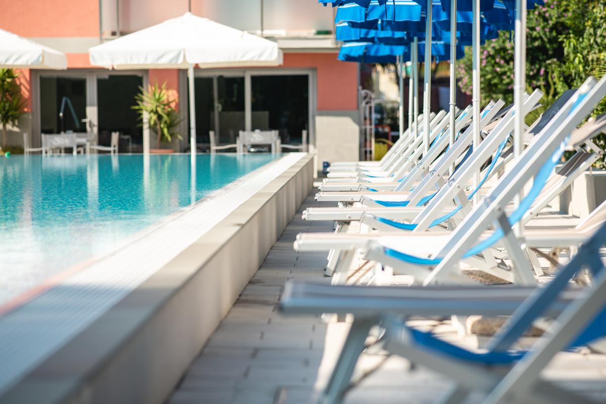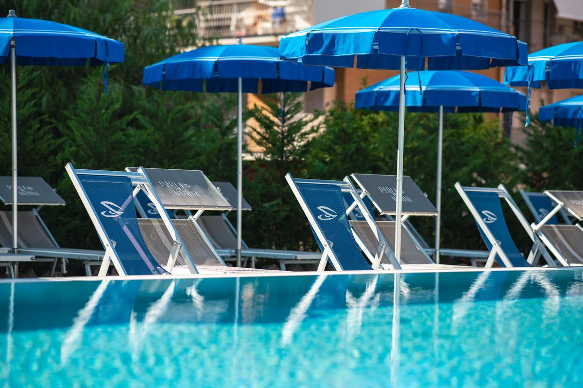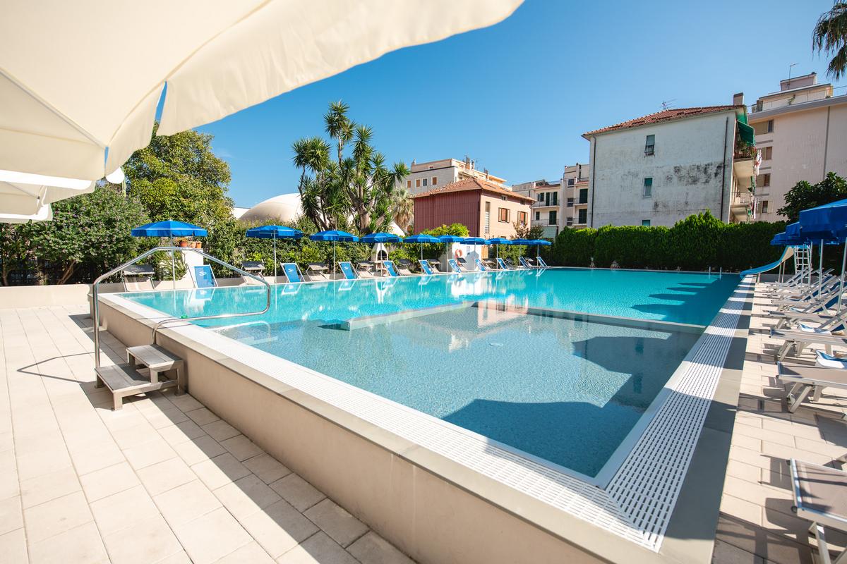 La zona comune più apprezzabile è la piscina olimpionica con una superficie di 250 mq, una capienza di 510 mc. di acqua, una profondità minima di 1 metro e massima di 3 metri. La superficie adiacente è circondata da un giardino di palme e colorati oleandri ed è attrezzata con sdraio, lettini ed ombrelloni. A bordo piscina si trova un barbecue a gas a disposizione di gruppi di amici che desiderano cimentarsi nella cucina alla griglia, e che possono degustare carne o pesce a bordo piscina nelle serate estive.